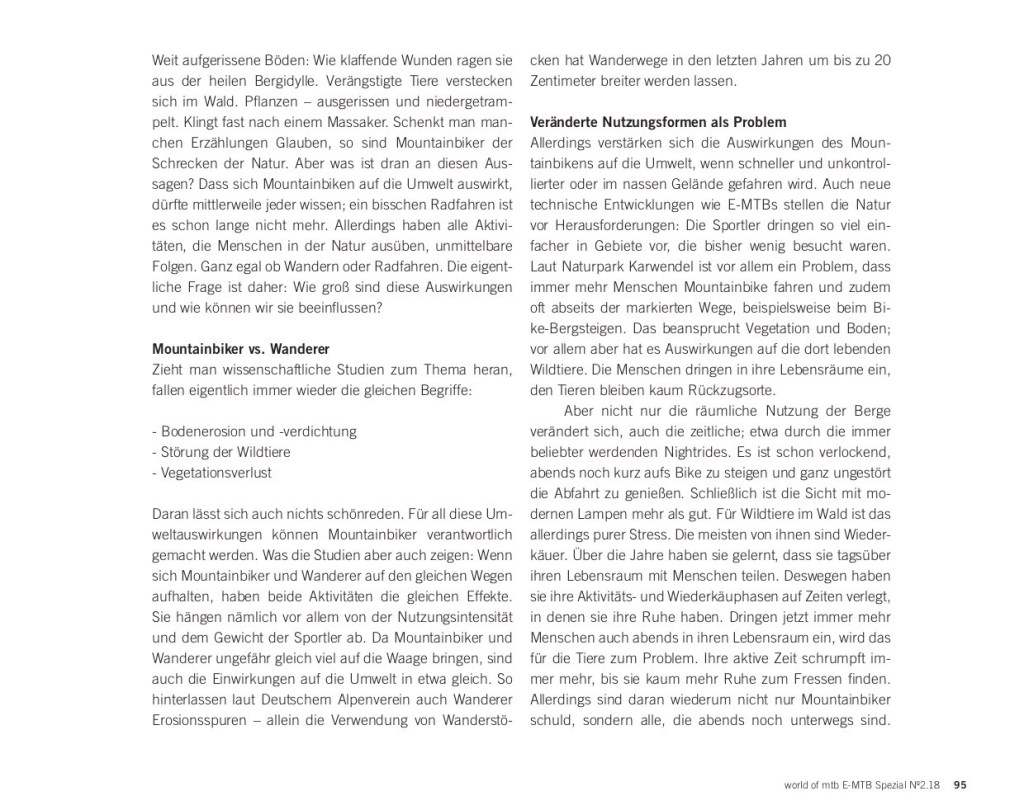Weit aufgerissene Böden: Wie klaffende Wunden ragen sie aus der heilen Bergidylle. Verängstigte Tiere verstecken sich im Wald. Pflanzen – ausgerissen und niedergetram- pelt. Klingt fast nach einem Massaker. Schenkt man man- chen Erzählungen Glauben, so sind Mountainbiker der Schrecken der Natur. Aber was ist dran an diesen Aussagen?
